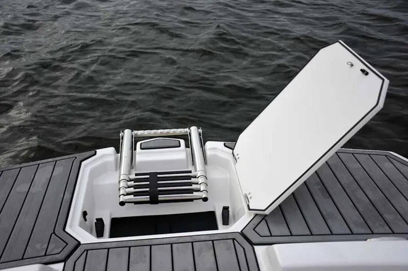 Other features include a pressurized water system, bow and stern livewells, transom shower, ski pylon, cup holders throughout the boat, platforms located at both the bow and stern, rear facing speakers with transom remote, and Jensen speakers.