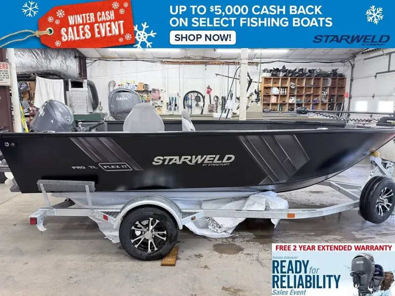 Powered by Yamaha F70LB tiller, 55# Minnkota Powerdrive, Livewell, Swim Platform, Custom Trailer w/ Swing Tongue & Spare Tire17 DC Pro SpecsMax Horsepower;75Beam;90Dry Weight;1227Max Persons;6 / 765 lbsInterior Depth;28Transom Height;20Fuel Capacity;26 Gal.Length;16'4'Number of Seats;3Built for organization and fish-friendly adventures, the Starweld by Starcraft Flex 17 DC Pro aluminum fishing boat prioritizes keeping your gear secure and your bait thriving. Standard features ensure you're prepped for a successful day on the water. Lockable in-floor storage compartments provide a safe haven for tackle boxes and other essentials, while the lockable center console conceals a dedicated space for eight 7' rods, keeping them protected and organized. The 12-gallon bow livewell ensures your live bait stays healthy and lively throughout the day, and the 18-gallon stern livewell boasts a built-in bait bucket, the perfect solution for keeping your prized catch healthy until you weigh them in. With its focus on functionality, secure storage, and optimized livewell capacities, the Starweld by Starcraft Flex 17 DC Pro aluminum fishing boat is ideal for creating unforgettable fishing memories.