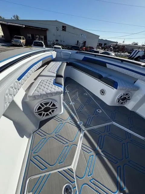 This Dealer demo has less than 30 hrs on Triple V-10 400 Mercurys and is LOADED with Equipment Including the Arch Sport Top ($30K Option)t Dual Garmin GPS plotters with integrated CZone touch control system, HUGE JL Audio system, Bow thruster, Windlass anchor,Shureshade Electric sunshade, Enclosed head with shower, Marine Matt flooring, throughout the cockpit and engine well, Cockpit and Underwater LED lights, Beautiful $48,000 Custom paint with Color matched Interior and Color matched motors.