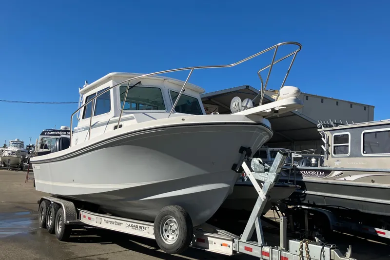 NEW 2025 28' Steiger half-wall Chesapeake version set up for West Coast fishing. The Half Wall design gives the optimum layout for fishermen who want the open feeling of a Miami version, but also want to add on the half bulkheads for rear station controls. This boat was ordered to specifications for the owner's personal boat, so she is loaded with options that make it a real head turner. The owner has opted to put her up for sale and has offered to reduce the price to reflect a shop's 'demo' boat....BUT....she has never been set up with electronics or put in the water. The OPPORTUNITY is here for you to outfit the boat with your preference of electronics and other amenities and save TENS OF THOUSANDS of the most popular Steiger in the fleet. Factory installed options include the Anchor Drum Roller, Kingston Gray Gel Coat hull w/ white striping, Full interior Bolsters, Bow Thruster, Fresh Water Cabin Sink, Underwater Lights, Fresh Water Wash Down, Marine Head, Steiger Pedestal Seat on Port Side Storage box, Port Side Tackle Cabinet, Battery Charger, Second Station Controls, Spot Light, Pop Up Cleats on Transom, Second Station Bow Thruster Controls, and sitting on a Custom Built Tri-Axle HD Aluminum Trailer,