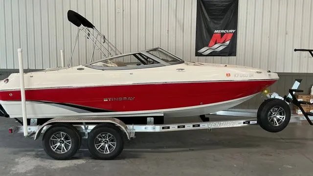 Here is your all around fun amazing color boat. The red and white exterior of this boat is sure to heads on the water. The exterior and interior of this Stingray is in amazing condition with only 174 hours on the boat. This Stingray offers a spacious and cockpit and bow area with plenty of seating and storage for all your boating accessories. The large Bimini will provide all the shade you will need on those extra sunny days. This Stingray also has a Jensen Bluetooth stereo with multiple speakers throughout the boat, It also offers easy to read gauges, bolstered captain and co-captian chairs for when you that extra height in your line of site. This Stingray also has a walk through transom, and a large layout area at the stern of the boat. This Stingray sits on a 2024 Venture aluminum trailer with aluminum wheels, and front ladder which allows you to board the boat from the front out of the water. This amazing trailer has less than 10 hours of operation (per the owner). This Stingray will make your family an incredilbe lake rid ethis summer for all new boating adventures. Engine Type: I/O