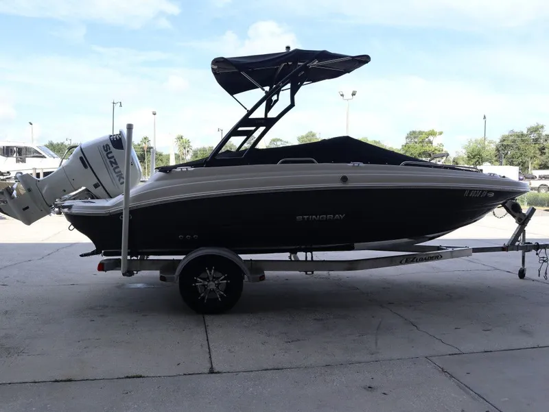 2019 Stingray 192SC, USED 2019 STINGRAY 192SC | SUZUKI 175HP Performance The 2019 Stingray 192SC is powered by a Suzuki 175HP four-stroke outboard, giving it excellent power for cruising, watersports, and family fun. The lightweight hull design paired with this engine ensures quick planing, smooth handling, and impressive fuel efficiency. Layout & Comfort At 20 feet, the 192SC combines deck boat space with sport boat style. The wide bow provides wraparound seating with removable cushions, while the cockpit features a captain's helm chair, co-pilot seating, and a U-shaped aft bench. An extended swim platform with ladder makes water access easy, and multiple entry points provide flexibility for boarding. Features Equipped with a bimini top, stainless cup holders, in-floor storage for skis and gear, and dedicated cooler space, this Stingray is ready for long days on the water. A bow boarding ladder adds convenience for beaching, while aft seating converts easily for lounging at anchor. Technology The helm is outfitted with a sport-style dash, tilt steering, Suzuki digital instrumentation, and a premium marine stereo system with speakers. Hydraulic steering and smooth throttle response make operation effortless. Safety Stingray builds with a focus on passenger safety, featuring non-skid flooring, stainless grab rails, and a deep freeboard design for added security while underway. The sturdy fiberglass hull ensures reliable performance in varying conditions. Specifications Year: 2019 Make: Stingray Model: 192SC Length: 20' Engine: Suzuki 175HP Four-Stroke Outboard Seating Capacity: 10 persons Key Features: Bimini top, bow & stern boarding ladders, in-floor storage, extended swim platform, stereo system