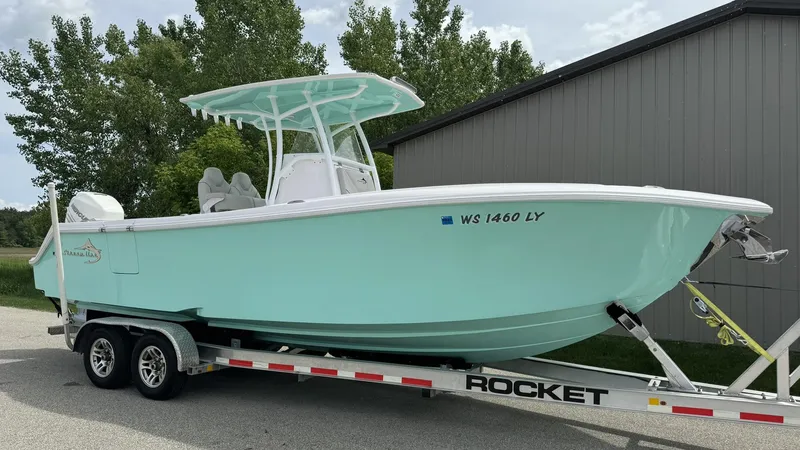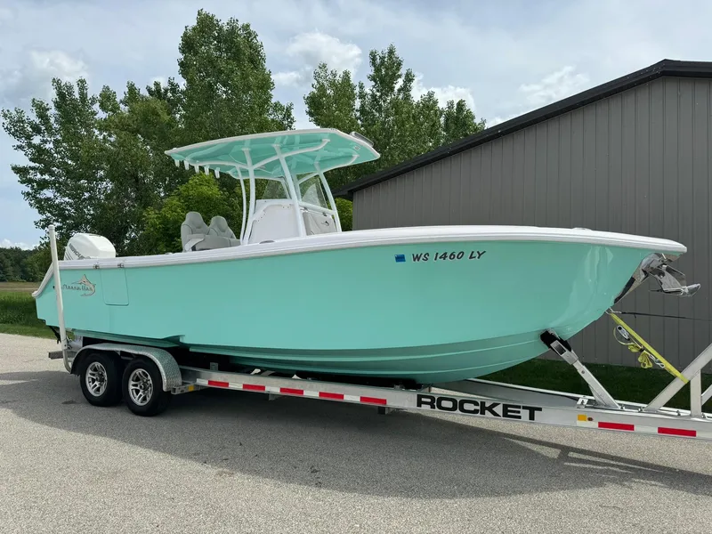 2022 Streamline 26 Center Console - Powered by a Mercury 350 Verado engine, the Streamline 26 is a versatile and sleek center console vessel with an 8.6' beam. Designed for performance and functionality, it boasts a top speed of 52 MPH and a comfortable cruise speed of 40 MPH. This model features a seafoam finish, a T-top with matched powder coating, and ample seating, including foldable transom seating and a leaning post with a pull-out cooler tray.