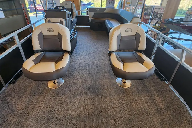 This seven-passenger fishing pontoon hits the water with new console and lounge designs. Get three extra cubic feet of storage thanks to clever backrest cut-outs. The redesign also adds a seat in front of the driver console, phone compartments, and four more cupholders. Cast from the shade of a standard 7' bimini top in one of the two folding fishing seats. Find your spot on the lake from the decked-out driver console, which comes with its own rod holder.