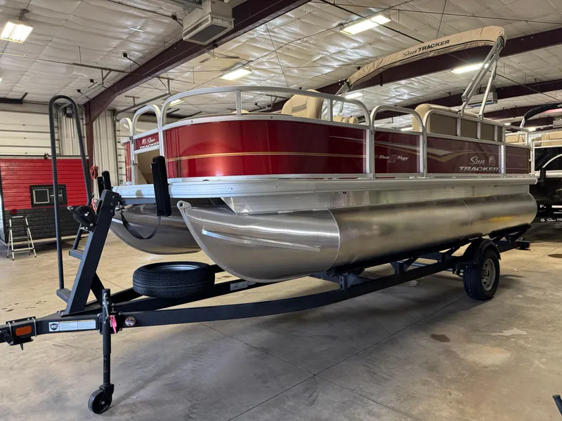• NEW 9' (2.74 m) SUN TRACKER® QuickLift™ Bimini top w/LED courtesy lights, storage pockets & protective boot (color-coordinated Sand w/Copper Red or Indigo Blue fencing)
