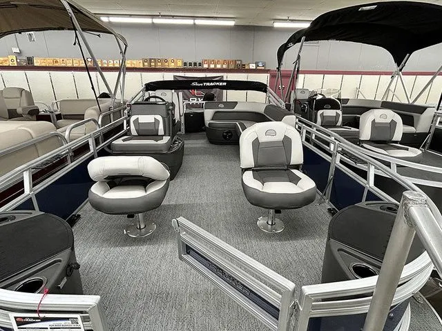 Up to eight fishin' buddies can take to the dual fishing decks of this redesigned fishin' pontoon. Three swiveling fishing chairs around a 10-gal. bow livewell and an 8-gal. aft livewell headline the list of features that make this the perfect boat for casting lines to catch fish and memories. When the fishing's done, sprawl out on the L-shaped lounge and crank up the stereo. The new and improved boarding ladder makes follow-up cannonballs a breeze. Other features new to the 2026 model year include three extra cubic feet of storage space, more cupholders, in-lounge storage, and a new seat in front of the helm.