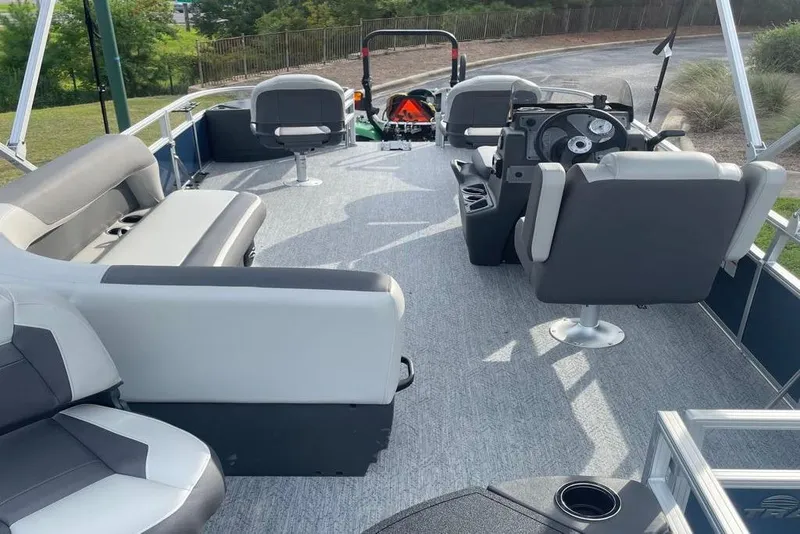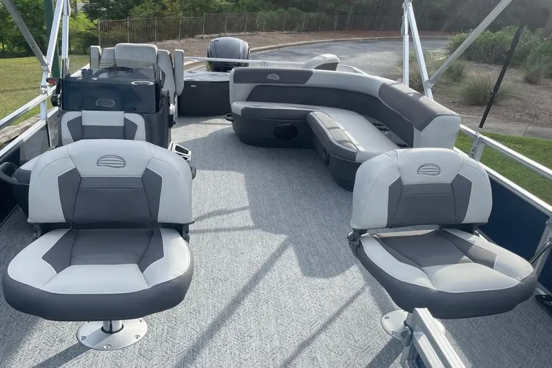 Up to eight fishin' buddies can take to the dual fishing decks of this redesigned fishin' pontoon. Three swiveling fishing chairs around a 10-gal. bow livewell and an 8-gal. aft livewell headline the list of features that make this the perfect boat for casting lines to catch fish and memories. When the fishing's done, sprawl out on the L-shaped lounge and crank up the stereo. The new and improved boarding ladder makes follow-up cannonballs a breeze. Other features new to the 2026 model year include three extra cubic feet of storage space, more cupholders, in-lounge storage, and a new seat in front of the helm.
