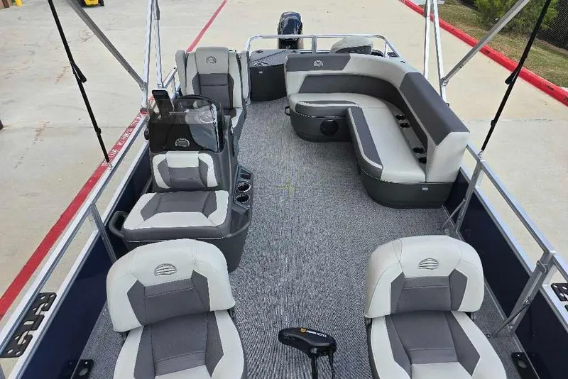 • Front fishing station w/2 pedestal seat base locations; rail-mounted rod & tool holders; & bow starboard storage compartment w/rod & drink holders
