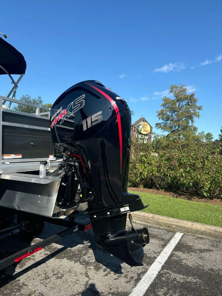 The FISHIN' BARGE® 20 DLX comes standard with a 90hp Mercury® ELPT FourStroke outboard motor and has a recommended maximum 90hp rating.