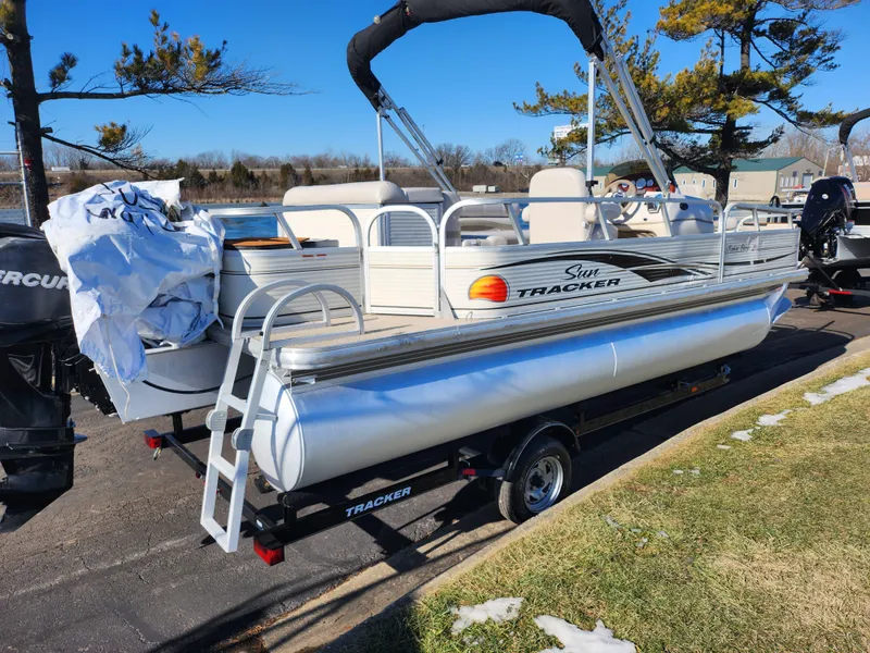2010 Sun Tracker 21 Fishin' Barge comes with: 60 h.p. Mercury ELPT BF with 356 Hours, Cover, Bimini Top, Swim deck with fold-down ladder, 2 front fishing chairs, Rod locker, Stereo/CD, rod holders throughout, front/rear livewells, , trailer, and more.