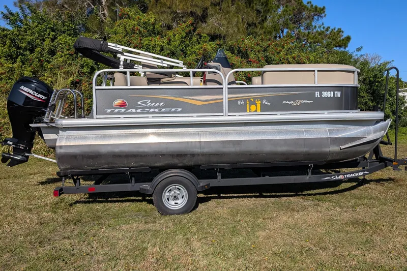 "Cruise into the lake life with the 2025 SUN TRACKER® PARTY BARGE® 16 DLX. The most compact pontoon boat in the SUN TRACKER® family makes towing a breeze. Its deck has plenty of room for a crew of 7 friends and family. Let them kick back on the 3 luxurious corner lounges while the pilot sits at the helm in the swiveling captain's chair. Each seat is wrapped in luxurious and durable vinyl. The wraparound fence sports a port wheelchair-accessible gate. You'll also find gates at the fore and rear boarding platforms.