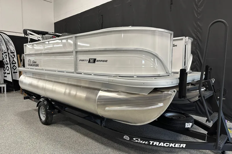 Cruise into the lake life with the 2025 SUN TRACKER® PARTY BARGE® 16 DLX. The most compact pontoon boat in the SUN TRACKER® family makes towing a breeze. Its deck has plenty of room for a crew of 7 friends and family. Let them kick back on the 3 luxurious corner lounges while the pilot sits at the helm in the swiveling captain's chair. Each seat is wrapped in luxurious and durable vinyl. The wraparound fence sports a port wheelchair-accessible gate. You'll also find gates at the fore and rear boarding platforms.