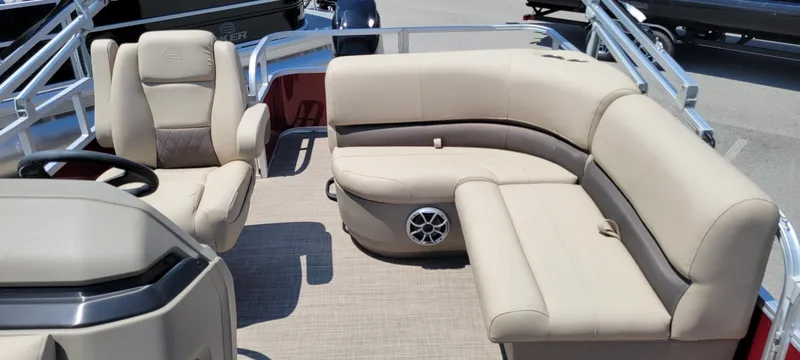 Upgrade your explorations with the 2025 PARTY BARGE® 18 DLX! Fit up to 9 passengers in this quality pontoon boat. They can relax on one of the 3 lounge couches while the pilot stays comfortable in the swiveling, telescoping captain's chair. Those lounges feature under-seat storage with plenty of space to hold all you need for today's aquatic adventure. The console also features a hidden storage space perfect for stowing away a cooler.
