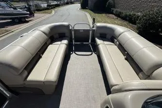 Regardless your crew's size, this pontoon boat packs the right amount of features for a full day of fun. To start, check out the dual bow couches and midship L-lounge, all with the STOW MORE™ seat storage system to provide plenty of space for gear (the seat-back compartments can even be accessed safely while cruising!). Or, crank up the Bluetooth® stereo and take a cooling dive off the full-width swim platform-there's even an extra-large ladder for easy reboarding.