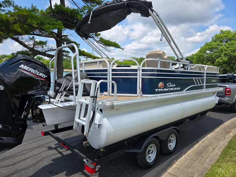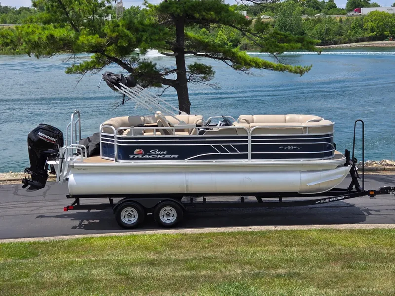 2022 Sun Tracker Party Barge 20 DLX comes with: 90 h.p. Mercury LCT 4S with 149 Hours, Custom Cover, Power Bimini Top, Lowrance Electronics, Swim Deck w/ Ladder, Ski/Tow Bar, Trailer, and more.