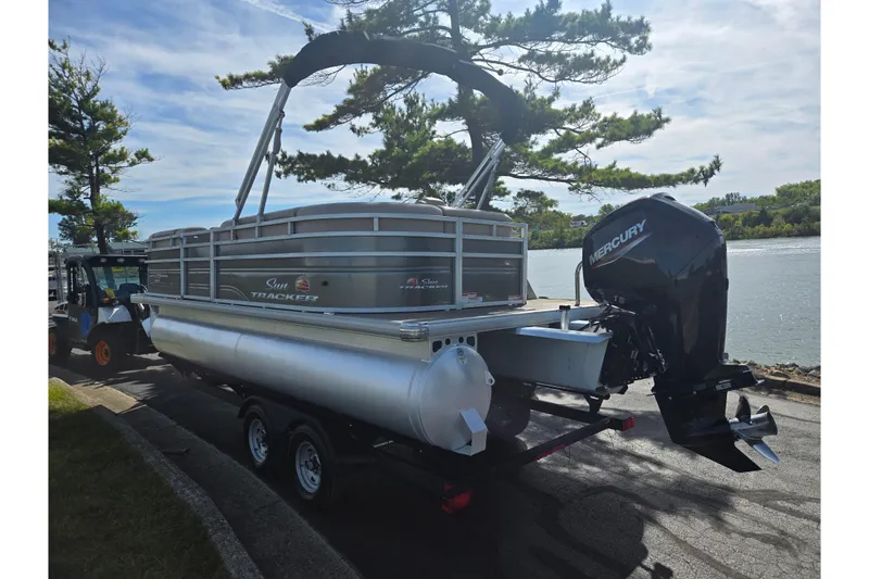 2024 Sun Tracker Party Barge 20 DLX comes with: 90 h.p. Mercury GT with ONLY 23 Hours, Swim Deck w/ Ladder, Cocktail Table, Bimini Top, Wet Sound Stereo/BT, Trailer, and more.