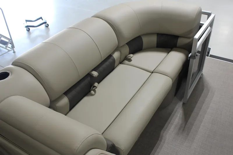 This PARTY BARGE® features the STOW MORE™ system, which puts storage spaces under the seats and behind the seat-back cushions of the 2 comfortable couches and L-shaped aft lounge. The couches and lounge feature 2 movable drink holders and a removable table with extra drink holders. The captain's chair reclines and boasts self-leveling arms for comfort.