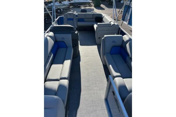 Some exciting new changes come with the 2026 model! The captain's console has received a complete facelift. The three corner lounges give your passengers plenty of space to relax in. These lounges have new accents that match the fence colors and also sport great new corner storage cubbies with more cupholders. Lift those pillow-top seats to reveal hidden storage compartments.
