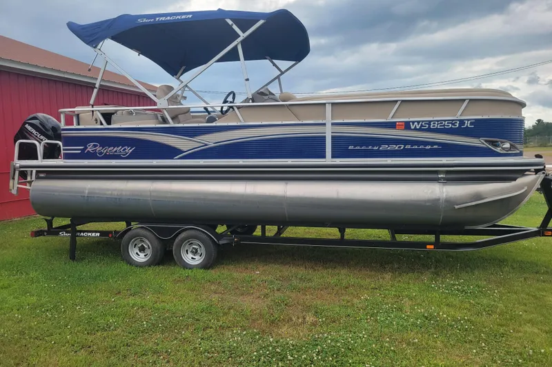 2013 Sun Tracker by Regency Party Barge 22 with a 90hp outboard motor and tandem axle trailer.