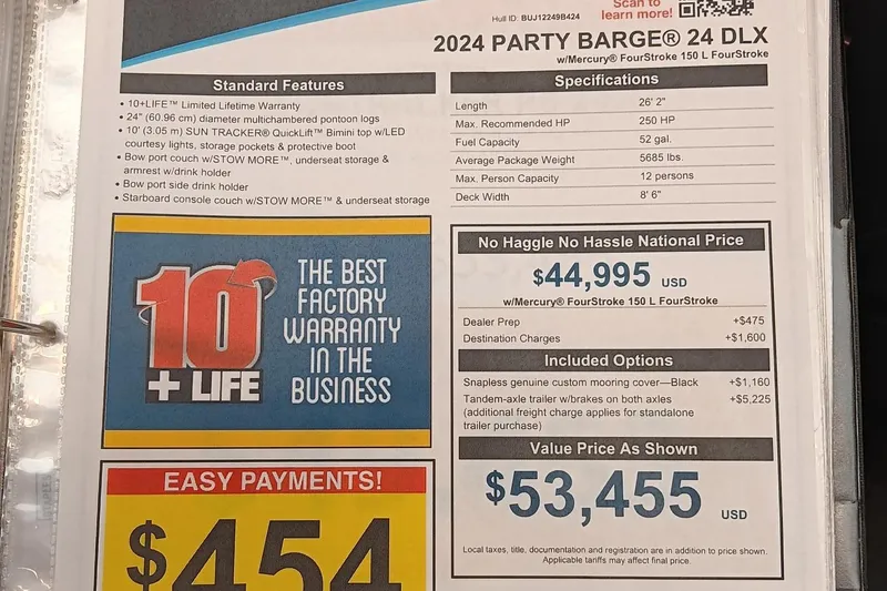 Many appreciate the comfortable seating that accommodates larger groups, making it perfect for gatherings and parties on the water. The boat’s versatile layout, including ample storage options and a well-equipped galley, adds to its appeal for daylong excursions. Customers also highlight the powerful and efficient performance of the engine, providing smooth rides whether cruising or towing water sports enthusiasts. The easy-to-use controls and stability on the water enhance the overall experience, making it accessible for both seasoned boaters and newcomers alike. Additionally, owners love the stylish aesthetics and customizable options, allowing them to tailor the Party Barge to their personal taste. Overall, the 2024 Sun Tracker Party Barge 24 DLX is celebrated for delivering an enjoyable, hassle-free boating experience that brings families and friends together on the water.