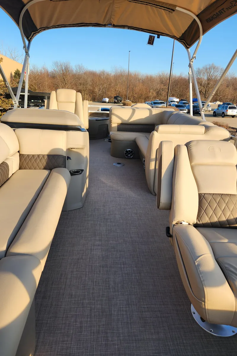 - NEW 9' (2.74 m) SUN TRACKER® QuickLift™ Bimini top w/LED courtesy lights, storage pockets & protective boot (color-coordinated Black w/Black fencing or Sand w/Caribou fencing)