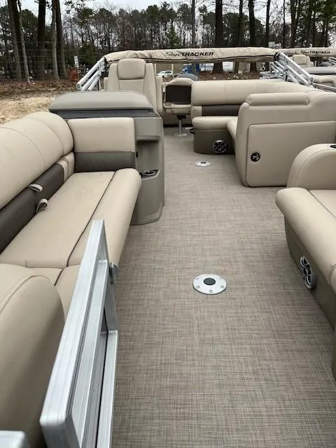 Whether you're on the water to get some fishing done or party it up with family and friends, the 2025 SPORTFISH™ 22 DLX has you covered! This SUN TRACKER® pontoon boat offers room for up to 10 passengers on its 22' deck. The anglers will love the aft fishing deck with dual swiveling fishing chairs that you can fold and remove, a lockable rod compartment, rail-mounted rod and tool holders, and an aerated livewell under the rear bench. Keep your fishing accessories organized in the tackle-storage station.
