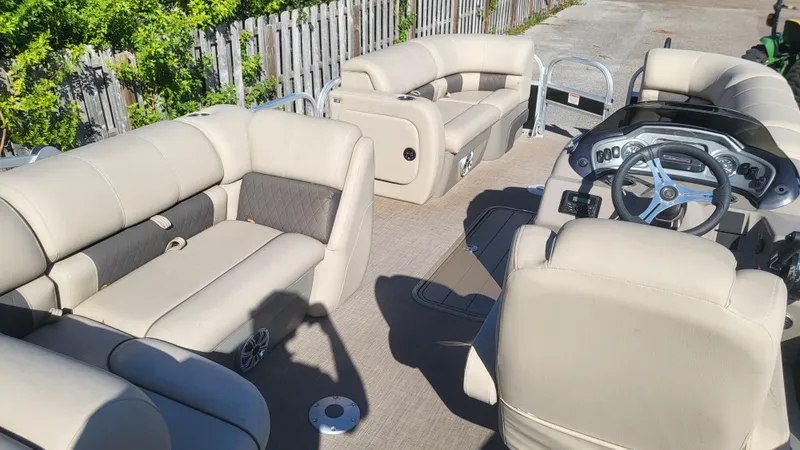 At the bow, it's a pure party pontoon with dual lounge seating. Midship, it's perfect for families with an L-lounge that sits under the new 10' Bimini top (which also has a powered system for easy setup). Aft, it's all fishing with dual fishing chairs, a 16-gallon livewell and rod storage (including a convenient lockable box). Throughout, STOW MORE™ storage, an in-floor compartment, table, new stereo system and more are ready to provide convenience and comfort for any activity.