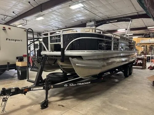 This SUN TRACKER pontoon boat's 24' deck stays stable thanks to 3 pontoon logs with lifting strakes. Be ready to wet a line at any moment with the lockable rod box. From the bow casting decks dual removable and folding fishing chairs, anglers can take advantage of rail-mounted rod holders, an aerated livewell, the tackle storage compartment, and more.