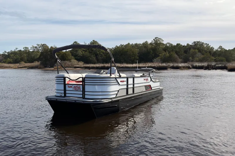 Like-new 2023 Suncatcher 324 Elite powered by a 2025 Yamaha 300 HP with ZERO hours and trailer included.