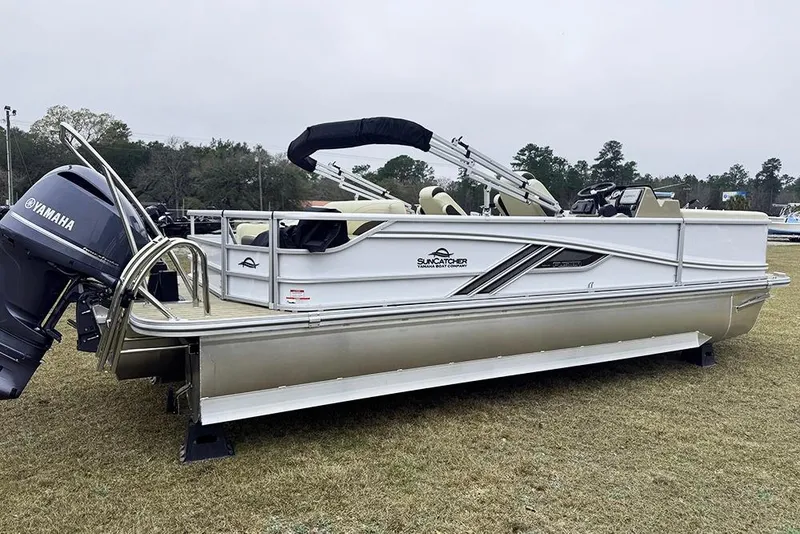 This White SunCatcher Fusion 324SL has a YAMAHA F225XB outboard motor.