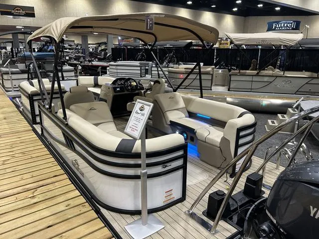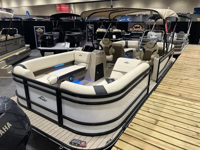 2025 Suncatcher Select Series 322RC W/Yamaha 150, Boat Pkg. Includes: Yamaha 150, Sea-Star Hydraulic Steering, 4 Speaker Upgrade, RGB Lighting, Dock Lights, Garmin Echomap 73SV, Trach Can Insert, Black Coated Rails and Trim, Mooring Cover, Flooring Upgrade, Tandem Axle Trailer