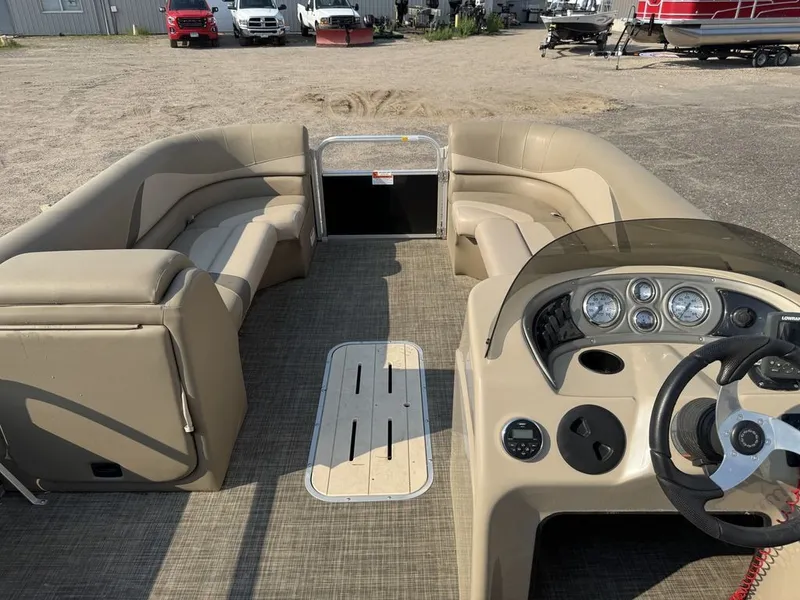 2016 SunCatcher V322RF Tritoon Pontoon with 115HP Yamaha Fourstroke EFI Outboard. This tritoon with rear fishing layout features 2 lounge style couches in front with an L-shaped couch in the middle and 2 fold down fishing seats at the rear. There is a livewell console between the 2 fishing seats with 2 cup holders and 2 rod holders as well as vertical rod storage for 4 fishing rods. There is a fold down swim ladder and swim platform off the starboard side rear. There is a table mounted in front of the L-shaped couch. The helm and captain's chair reside on the starboard side. The captain's chair is a low back seat with swivel and slide functions as well as fold up arm rests. The helm features a Tachometer, Speedometer, Fuel and Trim gauge. There is a Lowrance fish/depth finder and Jensen Bluetooth audio stereo system. There is also a water-tight storage pod built into the helm. This unit has in-floor storage inside the middle pontoon. The lounge end of the port side couch has a built-in flip up privacy/changing station. This Sun Catcher tritoon has a lifting strakes and performance sheeting installed as well. This Pontoon is rated for 12 people Warranty Is Included In Sale Trailer Not Included But Available For Use Or Purchase $29,995 Visit Us @ www.boatworldmn.com or Call (763)434-9655 Boat World 21155 Highway 65 NE East Bethel, MN 55011 For More Used And New Pontoons Come on out and see what we have in stock!