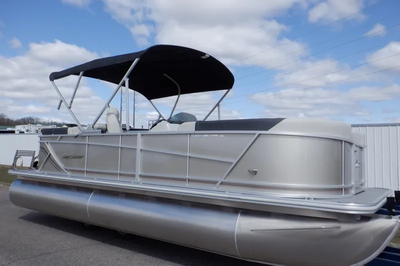 The SunChaser Geneva 22 LR DH pontoon boat is a great choice for accommodating larger groups with its maximized seating capacity and all-day amenities, including a flip-up changing room with space for an optional Porta Potti, a removable table and a color-coordinated bimini top.