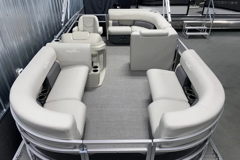 The SunChaser Vista 20 CRB pontoon is designed for both relaxation and fun on the water, with ample space and comfortable seating for everyone on board. Plush bench seating wraps around the interior, giving your crew plenty of room to spread out and enjoy the ride.