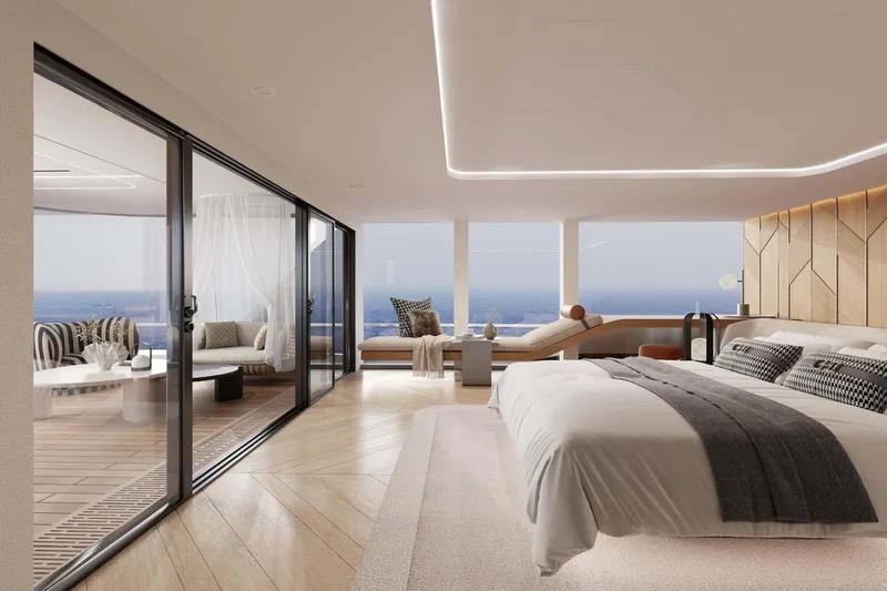 The eco yacht's ocean lounge features a vast walkaround relaxation area with direct access to the sea and plenty of storage for dive compressors, sea bobs, e-bikes, e-foils, sailing dinghies and tenders. This space connects with the yacht's full-beam aft cockpit, boasting plenty of sunning options and a spa pool with panoramic ocean views.