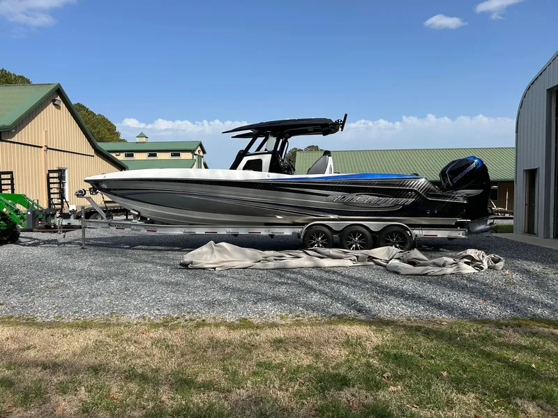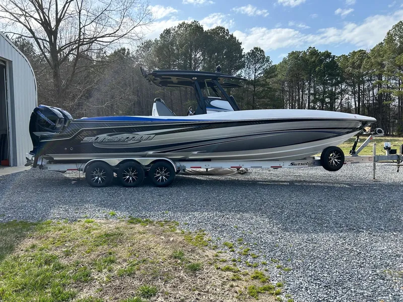 The 32CCX Center Cabin X-treme is in Sunsation's line of high performance center consoles. This specialty center console has been designed to accommodate a wide variety of recreational water activities, while providing the speed and handling of a high performance V-bottom boat. The Tres Martin designed hull features the proprietary SS Taper Ventilation Technology, the latest advancement in hydrodynamic science. This boat is powered by twin 400HP Mercury Racing Verados. Standard features include twin heavy duty marine batteries, dual bilge pumps, trim tabs, six low-profile pop up cleats, deck rails, stainless steel rub rails, frosted cabin sky light, head and Fusion stereo.