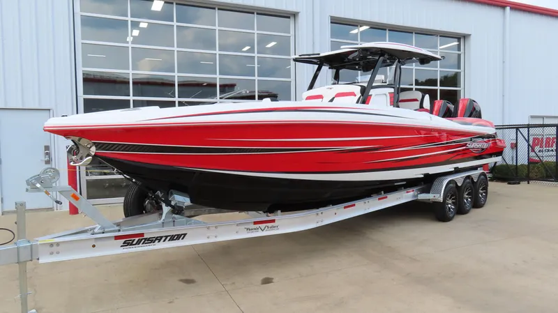 2025 Sunsation 32CCX powered by twin Mercury Racing V10 400R Verado. STANDARD EQUIPMENT; Additional battery with onboard charger and electric switch on dash, dual Garmin 8616s. Mercury Vessel View, Stage 2 JL Audio stereo upgrade with remote in bow, depth sounder, LED RGB color changing cockpit lights, Sea Deck flooring, Isotta steering wheel with tilt, LED trim tab indicators, Mercury Vessel View Garmin, pump out porta potty, and windlass anchor. OPTIONAL EQUIPMENT: Stage 2 stereo upgrade. White gelcoat on deck and modules, black dash, black hard top, Mitcher T custom paint, canvas package; includes TTop cover, Stern manual sunshade, and high pressure washdown.