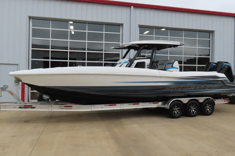 2026 Sunsation 32CCX powered by Mercury Racing 400 V10, Vessel view, 2-Garmin GPS, Fusion stereo with Stage 3 JL components, bow remote, Bow filler cushion, Sea deck flooring, Kplanes, Wash down, Battery charger, rear sun shade, led lighting, billet push button controls, windlass anchor, tilt helm, underwater lights, swim ladder, full cover