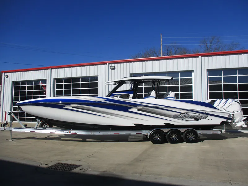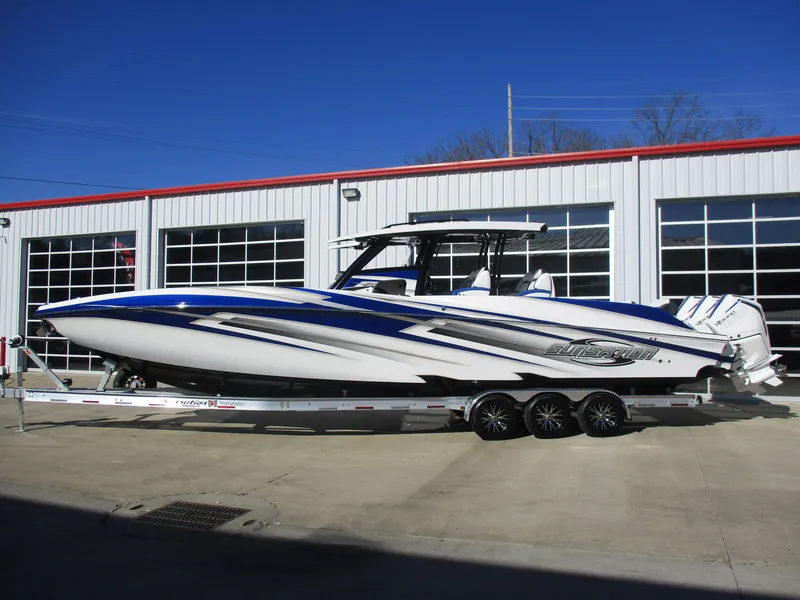 2021 Sunsation 40CCX powered by triple Mercury Racing 450R with 376 hours, dual Garmin 8622, Mercury Vessel View 903, radar, bow thruster, dual row seating, Kplanes, LED underwater lights, Fusion/JL Audio stereo, VHF radio, electric battery switches on dash, Isotta steering wheel, dive door, sea deck flooring, forward LED spreader bar light, windlass, cabin sink, porcelain head with holding tank and pumpout, full covers, T-Top cover, shore power onboard charger, and Phoenix aluminum trailer included.