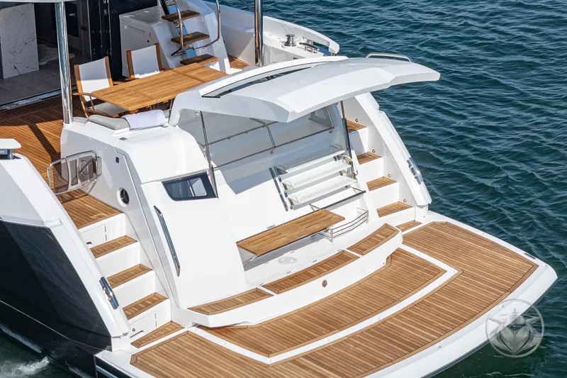 Access to the spacious guest cabins is via the lower helm and elevated companion seating whilst the sumptuous master cabin amidships is accessed via its very own staircase to port. This exceptional layout allows the owner and guests to move effortlessly between spaces.