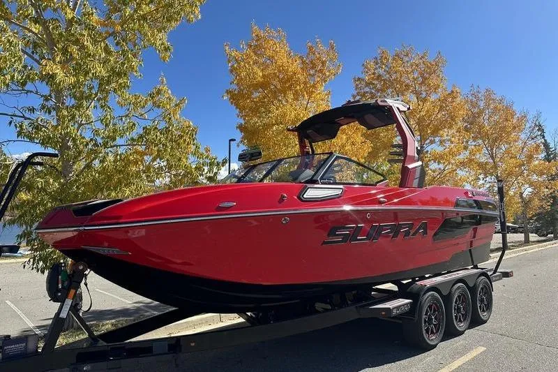 Supra SE 575 with Supercharged Raptor engine. DSD sound system, Swellsurf system, triple axle boatmate trailer.