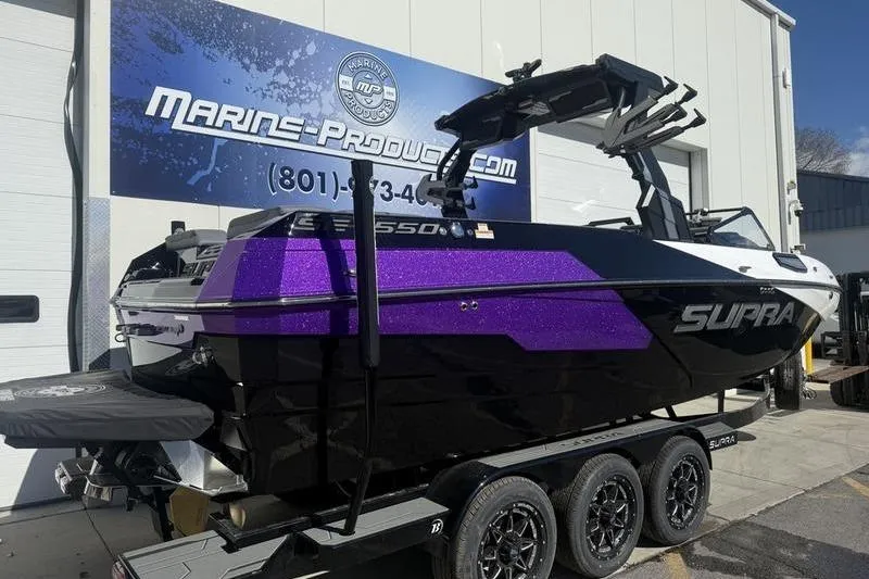 2025 Supra SE 575 with Supercharged Raptor engine. New self-deploying bimini, DSD sound system, triple axle trailer, stern thrusters included.