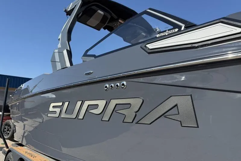 Supra SE 575 Supercharged Raptor engine. Trailer bow ladder, DSD sound system, Swellsurf system, self deploying bimini, transom thrusters included.