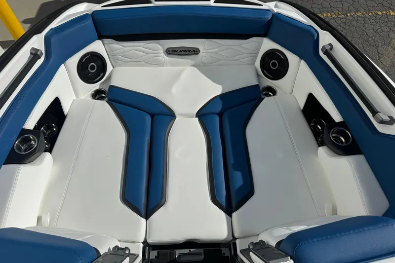 2026 Supra SE 550 with Supercharged 575 Raptor engine. DSD sound system, power bimini, stern thrusters, drop down platform step, Swellsurf system, clamping board racks, chill tech vinyl, triple axle Boatmate trailer with Bow ladder included.