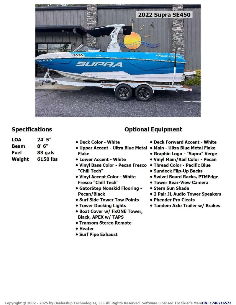 2022 Supra SE450, The 2022 Supra SE450 is a 24-foot, 5-inch towboat that combines luxury and high performance. Powered by a 450 HP Indmar Raptor engine, it is designed to create massive, customizable wakes and waves with its SurfStar system and a massive 4,700-pound ballast capacity. The boat features a spacious interior for up to 18 people, a Vision Control Center with dual touchscreens, and a power folding tower.