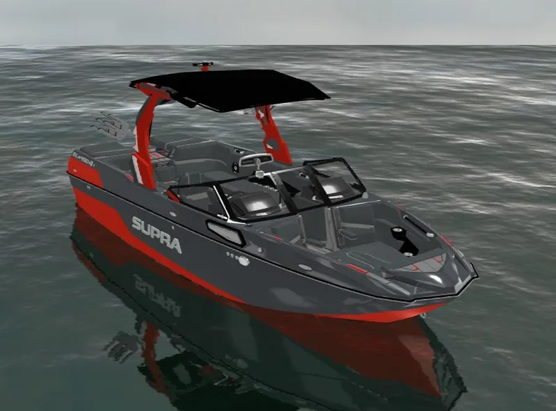 2025 Supra SL450 with Indmar Raptor 450 v-drive engine. This boat is loaded with tons of features including: cockpit cover, bimini top with surfboard storage, power folding tower, swivel/clamping board racks, powered captain's chair, heated captain & spotter seat, cockpit heaters, Supra exclusive Autowake system, Swell surf system, DSD audio system with 22 speakers, dual touch screens, rear stereo/surf remote, washdown system, stern sunshade, dual stern thrusters and a powered swim platform drop step. Also features an integrated inflatable air station for water toys. Boasting 4,000 lbs. of ballast and a 73-gallon fuel tank this boat throws massive surf waves! Max capacity of 17 persons. Colors are Dark Graphite and Chili pepper red (new for 2025)