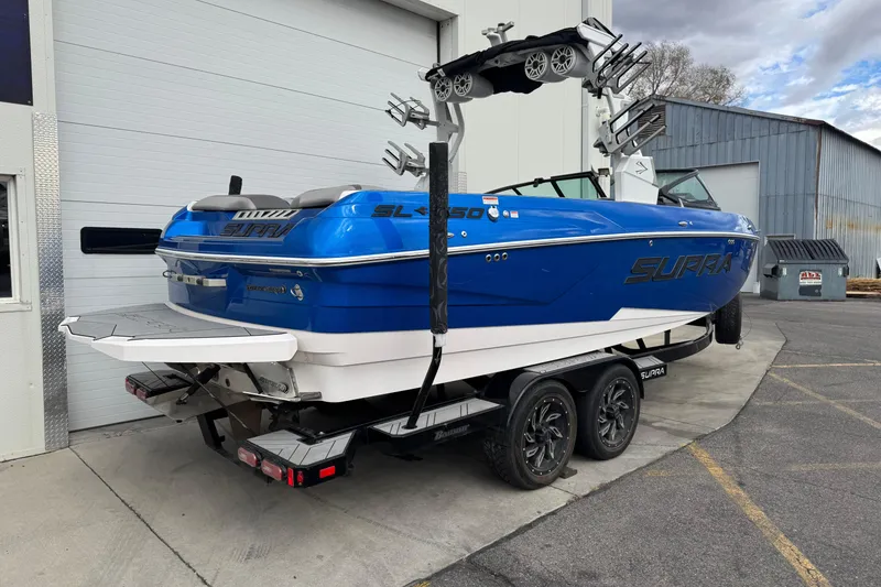 2020 Supra SL 550 with Raptor 575 engine with 540.7 engine hours. This boat comes with four sets of board racks, power tower, tower speakers, Boatmate trailer, Surf system.