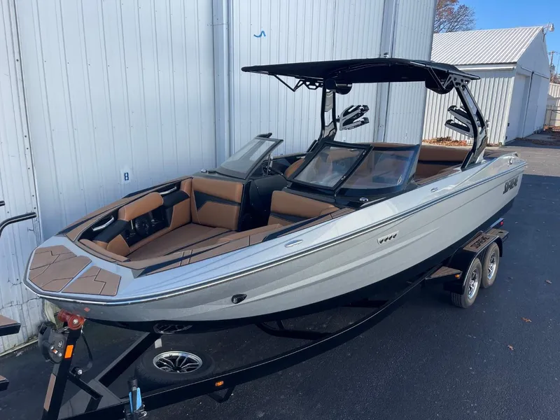 6.0L HO 450hp PCM engine, heavy duty prop, Core Graphics with matte black chromax decals, silver metal flake side and black hull. All OTB textured interior upgrade, brown interior with black accent, 2 color gator step flooring, Supreme Champ Stereo System with one pair Rev 10 Wet Sounds Tower Speakers, 8" interior speakers and 12" sub. Strapless board racks, driver's remote with volume knob, max factory ballast, Quick Surf surf system, cover, Bimini with surf sleeves, bow filler cushion, docking lights, heater, platform ladder, silent stinger wake plate, ski pylon, underwater lights, walk-through wind block, clamping wireless phone charger on dash, PTM Edge mirror upgrade, dual batteries, tandem trailer with matching gator step, bow ladder, spare tire and more.