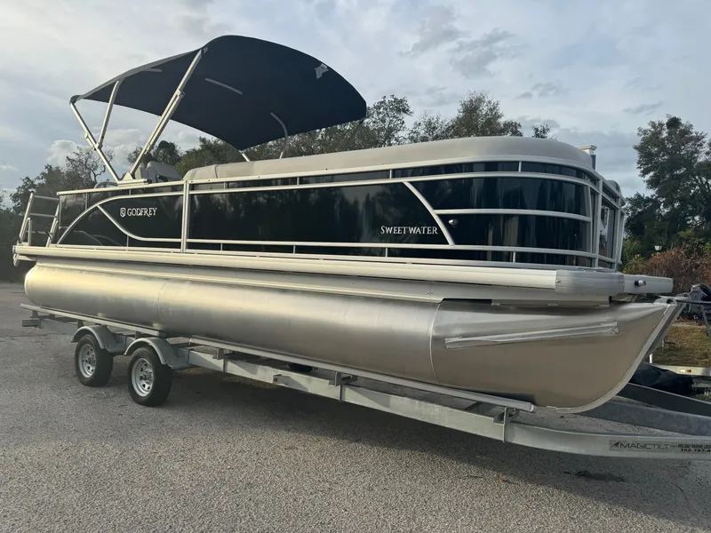 This sleek and versatile black Sweetwater SW2286CSE pontoon boat is built for comfort, performance, and style. With its triple-tube construction and spacious deck layout, it's the ultimate combination of luxury and practicality for both leisurely cruising and exciting adventures on the water.