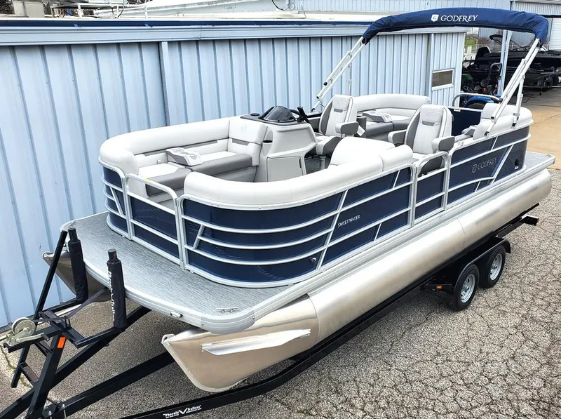 2023 Sweetwater 2286 Split Bench Xperience O/B (22' x 8' 6"). This boat is powered by a Mercury 115 HP Command Thrust 4 stroke EFI engine. The trailer is a tandem wide axle Phoenix with load guides, ladder winch stand & disc brakes. It has Metallic Navy rail skins, Anodized Silver rails, Platinum Gray interior base vinyl, full length Platinum weave vinyl flooring, captain & passengers reclining seat upgrade, LED docking lights, SST ski tow bow, pop up changing room-chaise, extreme steering w/ tilt wheel, windscreen, gimbal mount phone charger, Fusion stereo w/ 4 Black speakers, Bimini shade top & snap down playpen cover for storage. Pricing includes dealer prep & freight.